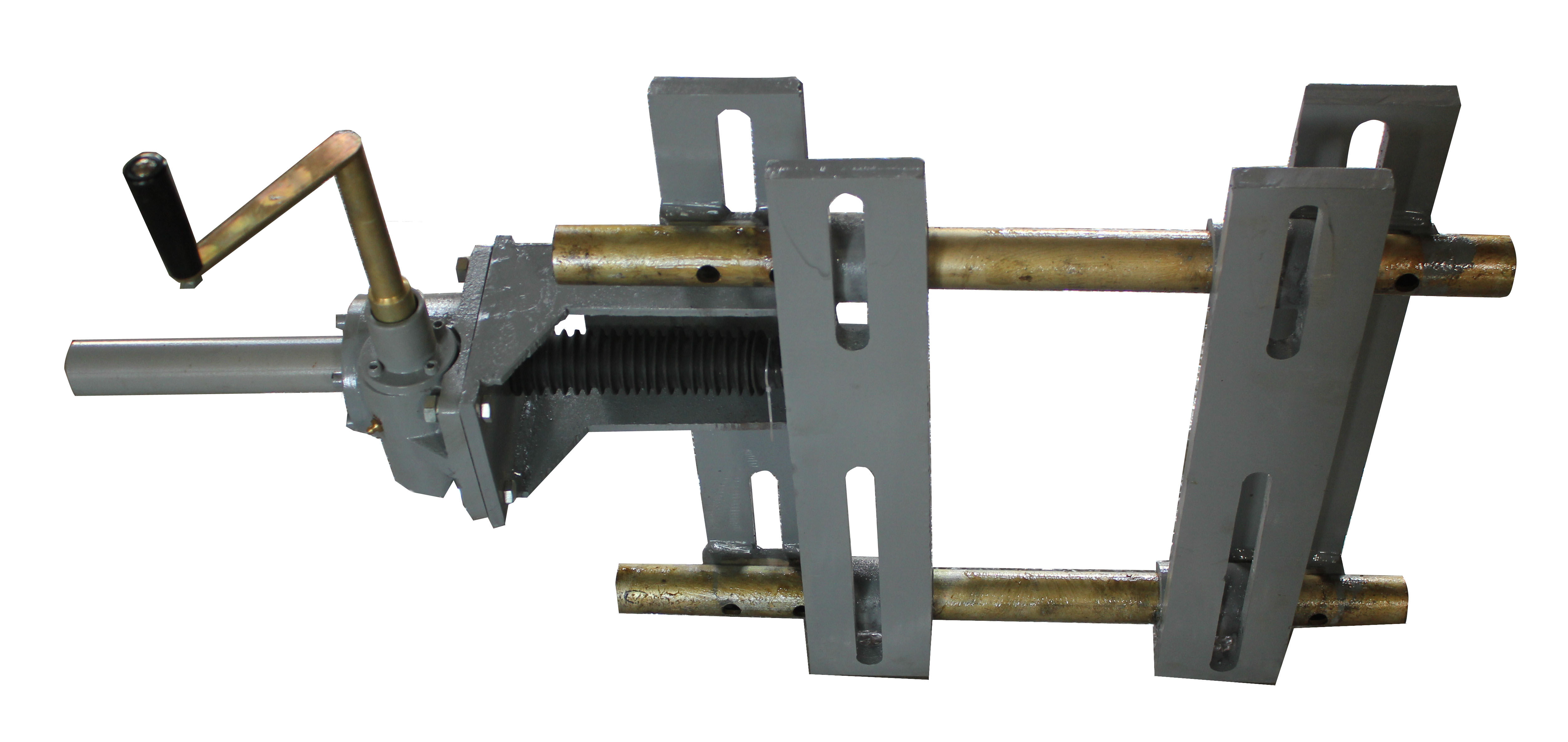 隨著石油能源需求量的急劇增加,各種抽油機械也夜以繼日地不停運轉,導致傳動皮帶時常因松動而在皮帶輪之間打滑,如不及時緊帶,傳動效率將會下降、甚或出現燒帶,給生產造成損失。普通油井換帶周期一般為兩月一次,特殊油井甚至一月一次,如需換帶則須停機,因此更換和調整必須方便快捷。其中,實用的方法就是在電動機底座上調整,原始方法是松開電機顧卻螺釘、用撬棍撬動電機,就位后再緊固螺釘。上述方法少需要兩個人以上才能完成,且若操作不當會帶來隱患;況且停井時間長,容易卡井,帶來更大經濟損失;另外由于電機底腳螺釘銹蝕、可操作空間狹小,使拆裝更為不便。因此亟需設計一種結構簡單、操作十娥、安全方便、適應范圍廣的 皮帶調整裝置。