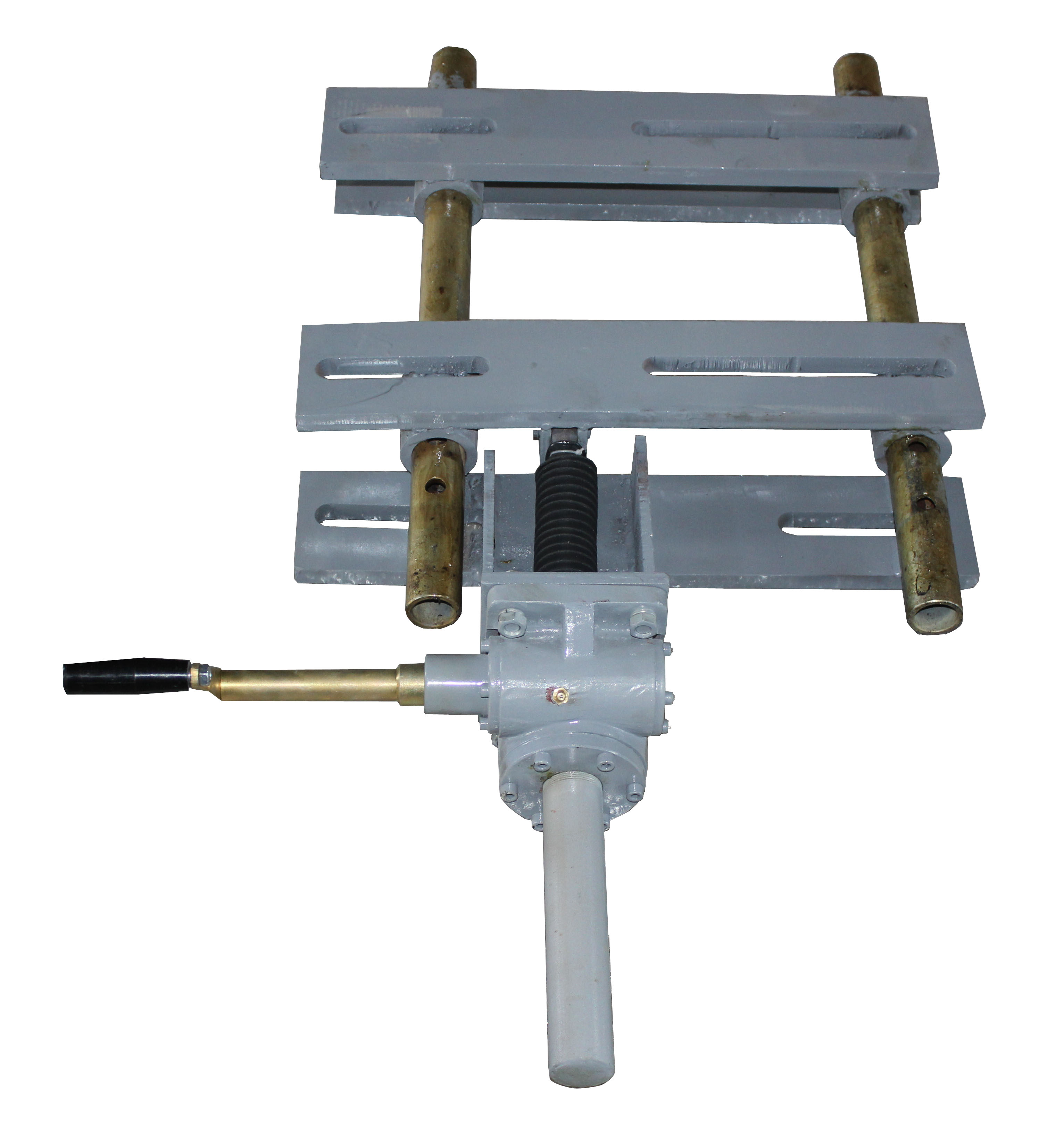 摘要:一種電機皮帶松緊度調整器,構成中包括底座,電機座,平移驅動裝置;所述底座兩側平行設置滑杠,所述電機座通過托架支撐在滑杠上,所述平移驅動裝置固定在底座一側,所述平移驅動裝置的動力輸出端與電機座一側連接,可帶動電機座作直線位移運動;在電機座上設有電機固定孔.本實用新型采用平衡位移原理,配裝蝸輪,蝸桿,絲杠傳動系統,使電動機產生平行左右移動,達到抽油機換帶和緊帶方便快捷的目的.采用搖臂輸入軸驅動絲杠,松緊皮帶或拆裝皮帶只需一個人即可操作,不用松動任何螺栓.具有較好的通用性,可根據需要調整滑杠長短,適合不同型號的電機使用,結構簡單,安裝方便,經濟實用.